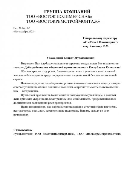 Уважаемые коллеги! С праздником- Днем работников оборонной промышленности Республики Казахстан! Благодаря вашей преданности делу, на завод стабильно развивается, показатели производства растут. Сегодня можно с уверенностью сказать, что АО «Семей инжиниринг» является одним из драйверов оборонно-промышленного комплекса Казахстана.